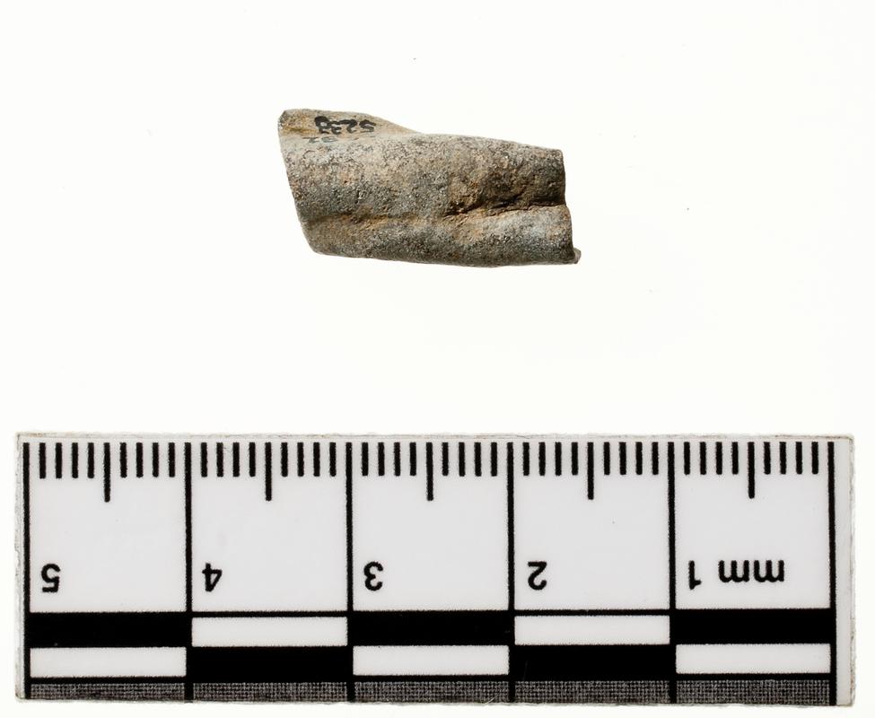 Strip of lead - bent over on one end and with a (nail?) hole along the the opposite and - possibly from an object - a barrel?