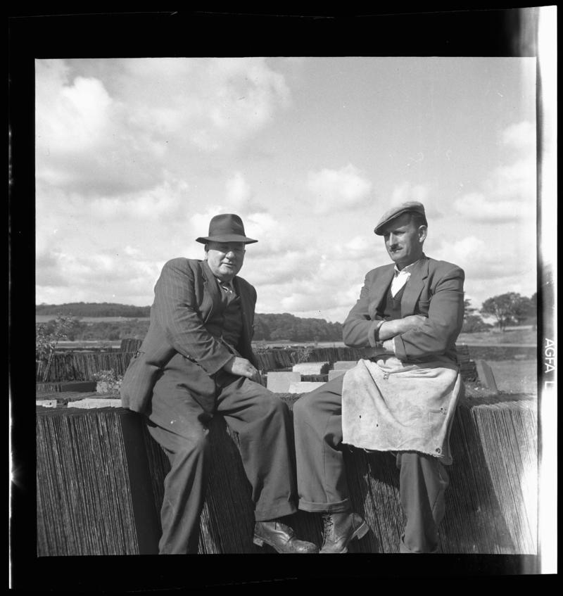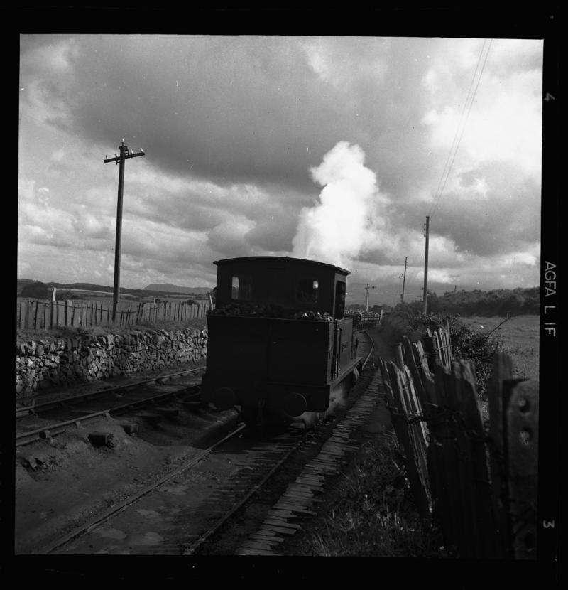 'Run' of empty slate wagons on transporter wagons, Padarn Railway, 1958-60.