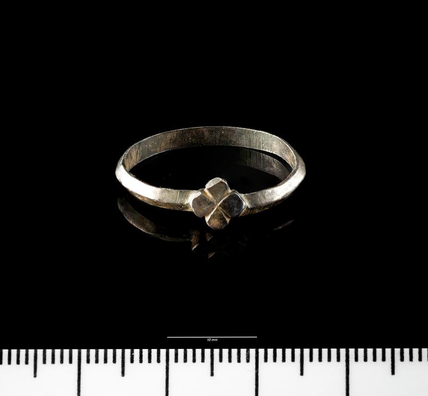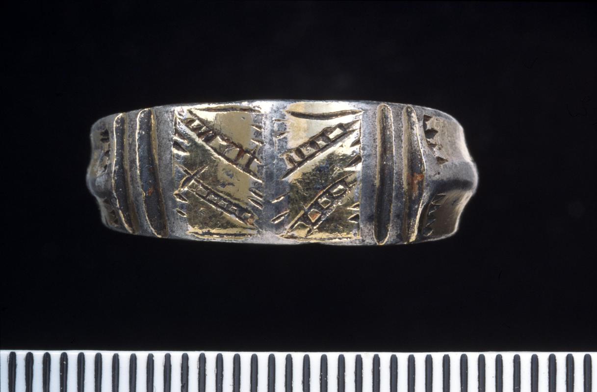 An incomplete, decorative silver posy-ring with some gilding present. The hoop attachment is of flattened D cross-section. The outer surface is cast with a repeating pattern of circular and diamond-shaped cells, the former having small raised quatrefoils, the latter raised single dots. Raised dots fill the field between the cells and the lplain borders. The areas between the raised decoration are inlaid with white enamel, most of which is now mising, with intervening raised gold spots and cells. The inner face of the hoop is inscribed with the text: FANCI... in Roman capitals.