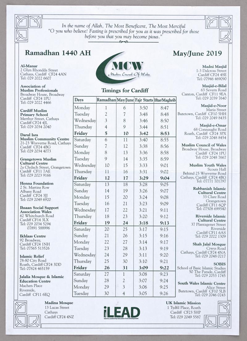 Green plastic Islamic Qibla compass set in rectangular case with clasp. Used to determine the direction of Mecca for prayer five times each day. Opens as book to reveal an Arabic inscription to the right and a holder to the left that holds a folded paper city index direction finder.