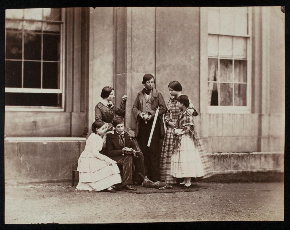 Salted paper print, from a collodion negative. Llewelyn children outside Caswell cottage. Shows (from left to right) Willy, Thereza, Lucy, Emma (standing), John and Elinor (holding doll). Taken for Emma's birthday on 23 September.