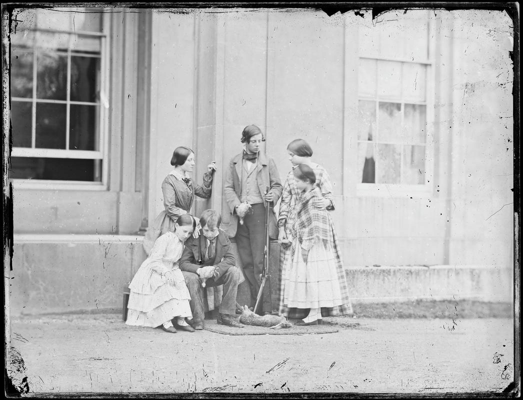 Salted paper print, from a collodion negative. Llewelyn children outside Caswell cottage. Shows (from left to right) Willy, Thereza, Lucy, Emma (standing), John and Elinor (holding doll). Taken for Emma's birthday on 23 September.