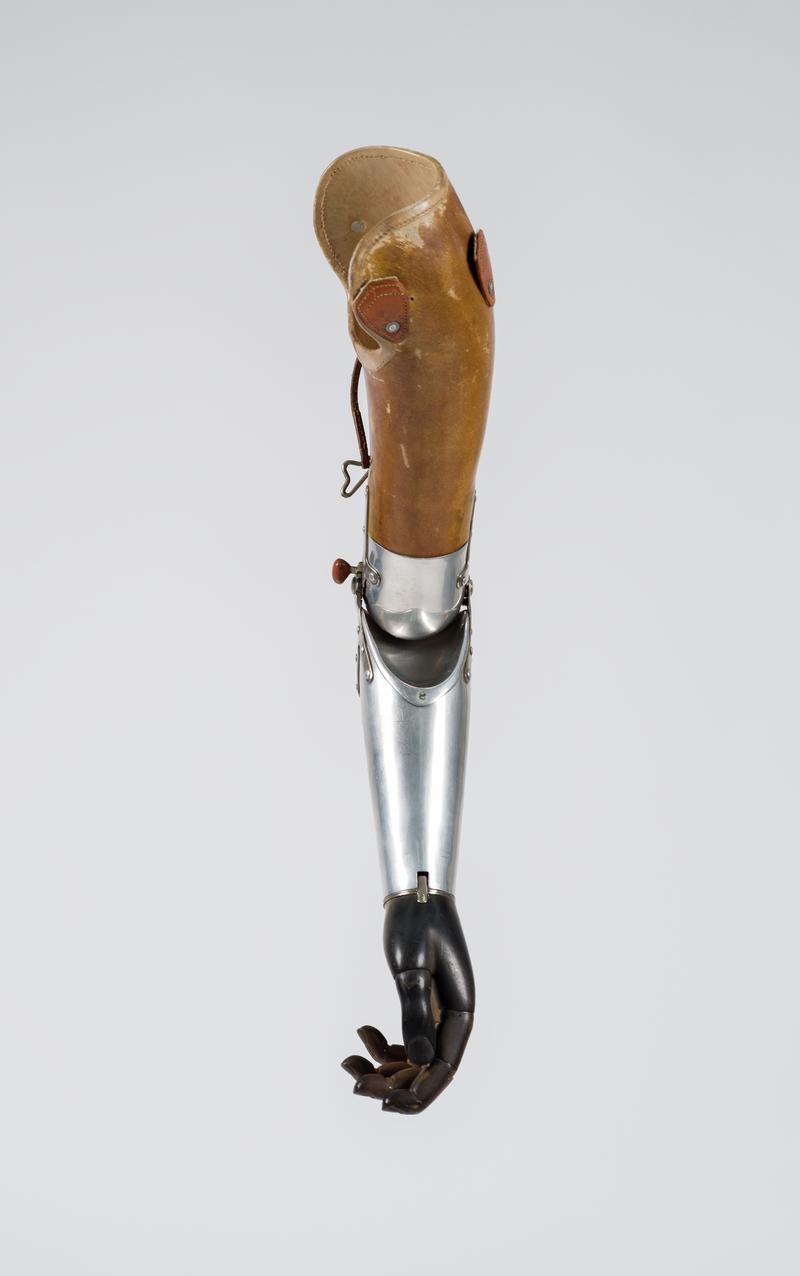 Below-the-knee prosthetic leg consisting of skin-coloured metal leg within a leather-encased foot.The metal leg is attached to a leather corset with metal braces and a leather strap; the corset can be tightened using a leather strap and lacing (missing). The artificial leg would have been attached to the body using a leather belt (not included).
