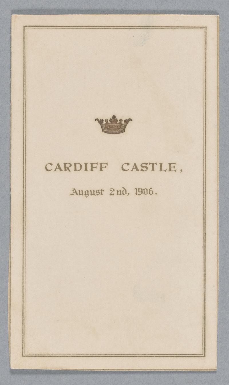 Printed menu card for a banquet to celebrate the 'Coming of Age' of Other Windsor-Clive at St Fagans Castle, 26 October 1905. Viscount Windsor was the eldest son and heir of Lord Windsor, Earl of Plymouth. They celebrated his coming of age (turning 21 years old) at St Fagans Castle and their main residence, Hewell Grange in Worcestershire. Other Windsor-Clive served as aide-de-camp to Earl Minto, Viceroy of India, and died of typhoid fever in Agra in 1908, aged 24.