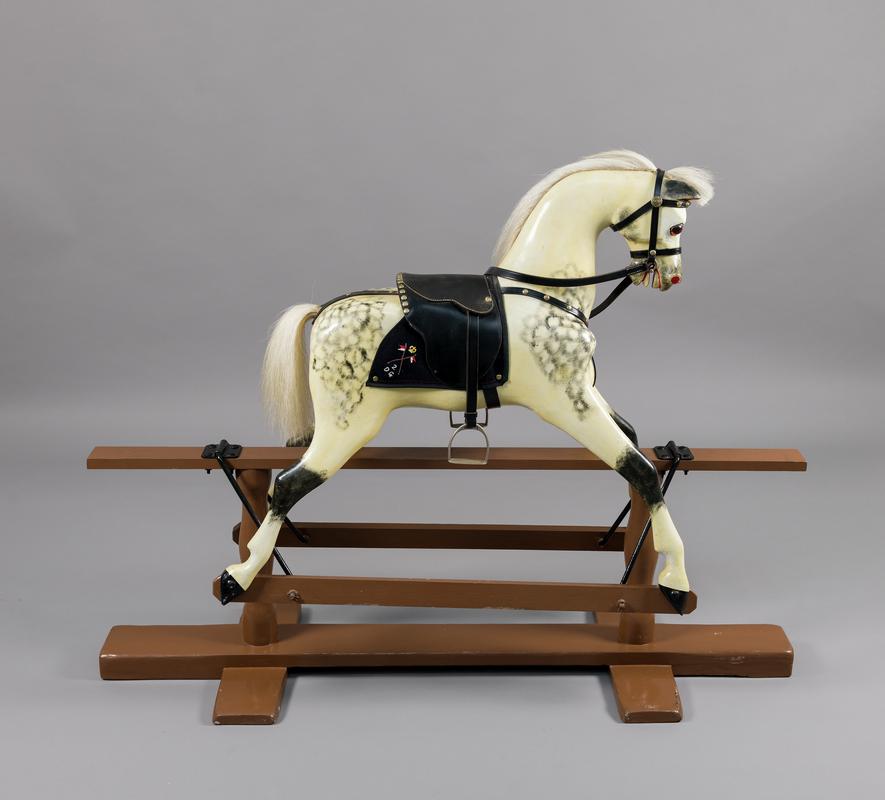 rocking horse with red painted steel frame, blue painted steel seat and foot rest, blue painted wooden support for white plastic horse's head with yellow plastic handles and red painted detail on ears, eyes and nose; most joints welded, seat held in position by steel nuts and bolts and foot rest riveted to frame