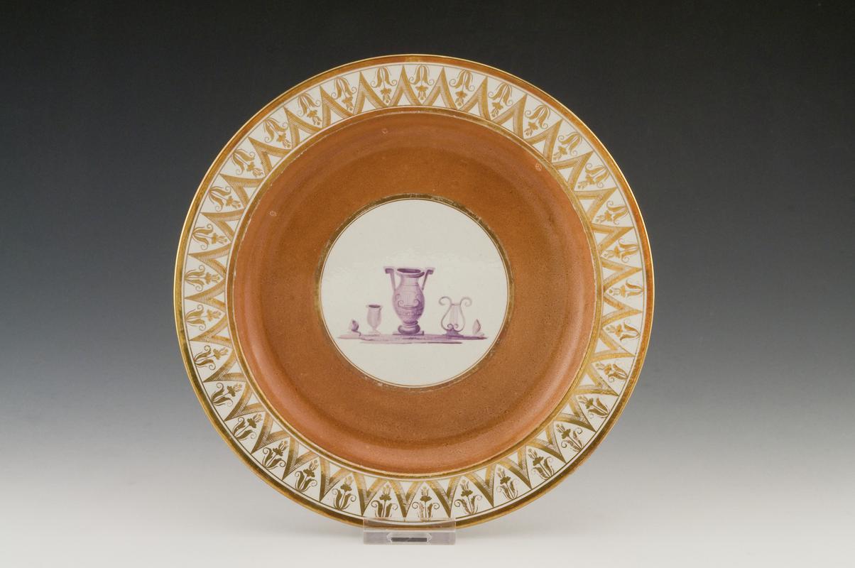 Plate, pearlware, round with slightly inset base, curved sides and spreading rim, eight notches on rim; transfer-printed decoration in underglaze blue with willow pattern-like design of temple and fence, diaper band around edge of well, border of moths and ruyi scrolls.