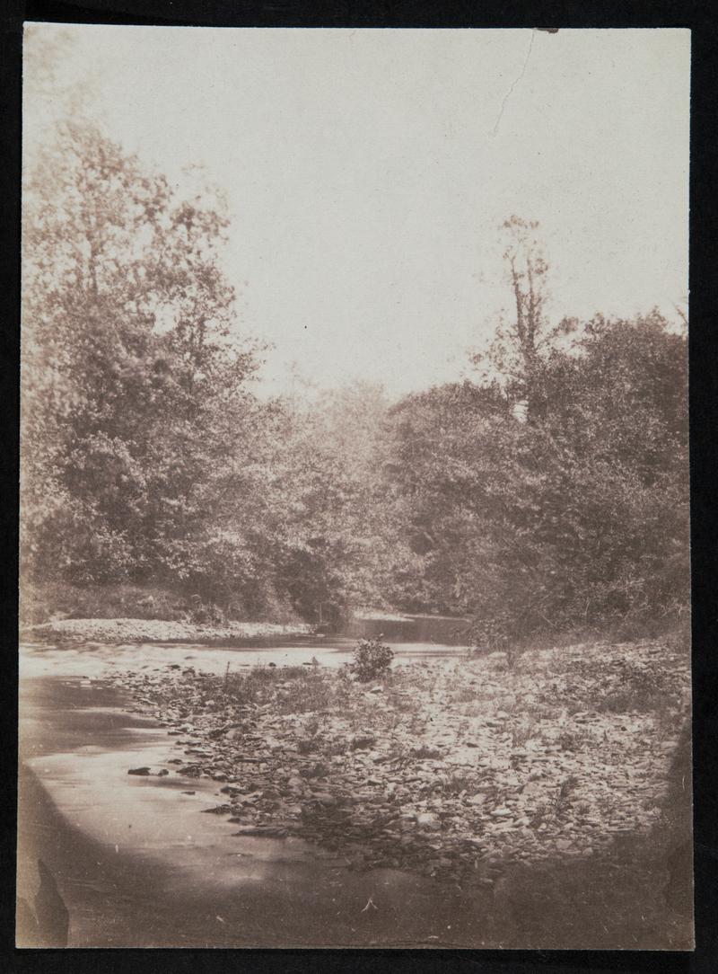 Salted paper print. Stream running through woods. All corners of photograph clipped.