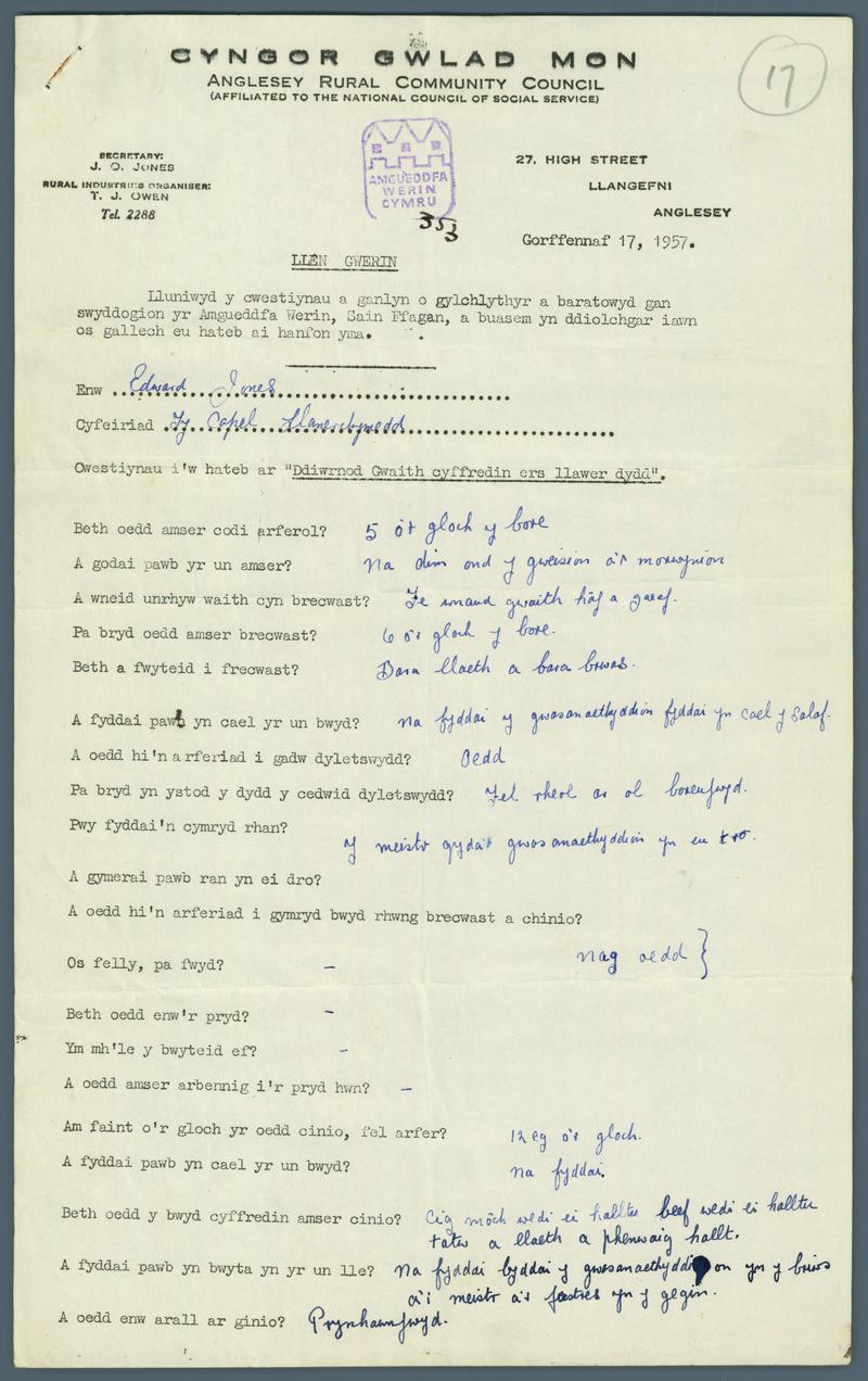Holwyddoreg ar Ddiwylliant Gwerin Cymru, 1937 Paratowyd gan Adran Diwylliant Gwerin Amgueddfa Genedlaethol Cymru a chyhoeddwyd yn Rhagfyr 1937. Anfonwyd yr holiadur i blwyfi, ysgolion a unigolion fel modd o gasglu gwybodaeth am bob agwedd o ddiwylliant gwerin Cymru. Rhannwyd yr holiadur o dan y pynciau canlynol: cartref ac aelwyd, bywyd corfforedig, bywyd diwylliannol, crefftau a diwydiannau. Roedd yr amgueddfa yn awyddus i ymgysylltu gyda phobl Cymru a chydweithio gydag atebwyr yr holiadur wrth fynd ati i gasglu hanesion a gwrthrychau fel sail i sefydlu Amgueddfa Werin Cymru yn 1948.