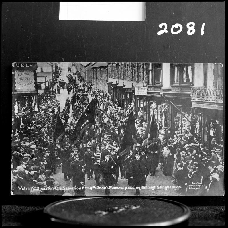 Black and white film negative of a photograph showing a funeral procession passing through Senghenydd. Caption on photograph reads 'The Salvation Army Pitman's funeral passing through Senghenydd'.