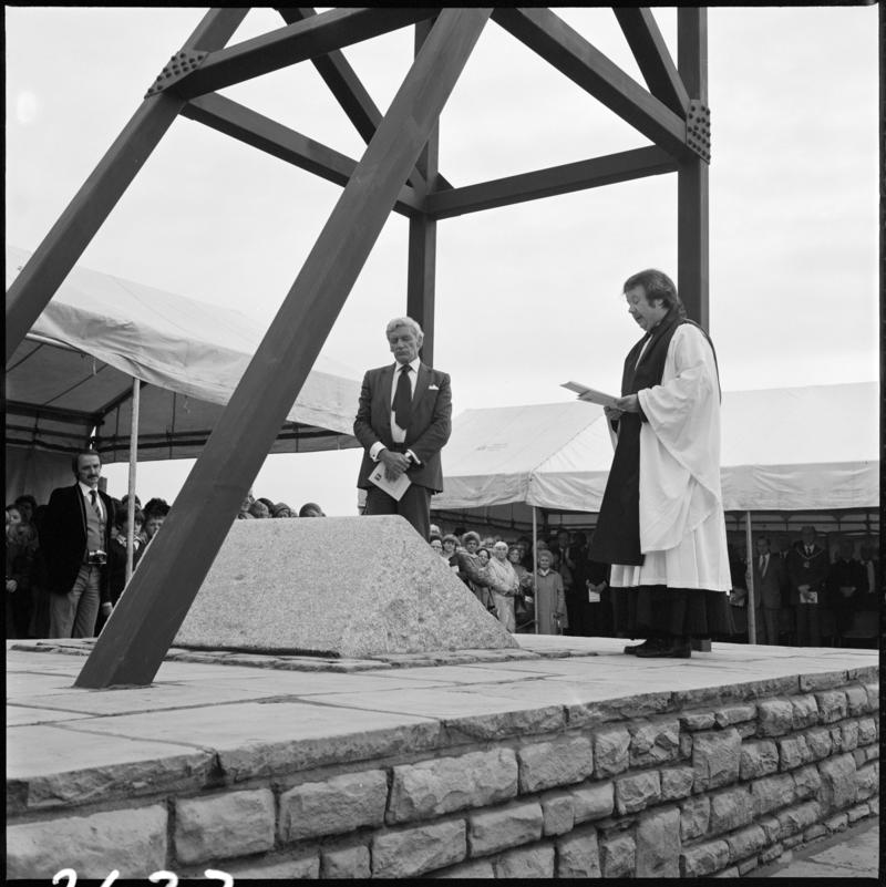 Black and white film negative of a photograph showing a funeral procession passing through Senghenydd. Caption on photograph reads 'The Salvation Army Pitman's funeral passing through Senghenydd'.