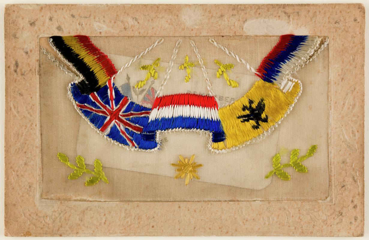 Cerdyn post yn cynnwys bathodyn cap aur boglynnog Iwmyn Penfro a darlun o filwyr a cheffylau. Cyhoeddwyd gan Brin Brothers Ltd, Llundain. Neges mewn llawysgrifen ar y cefn. Anfonwyd i gyfeiriad yng Nghlydach.