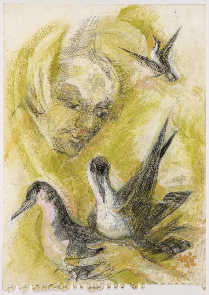 Bowl, stoneware, conical with a conical foot, decorated inside with a face and birds incised through a cream-coloured slip.