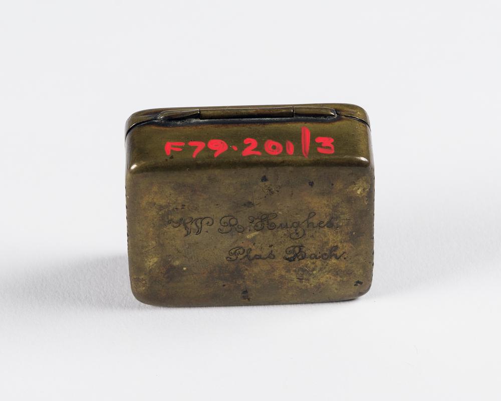 Small carved box, edged with bone and inlaid decoration containing 2 visiting cards.