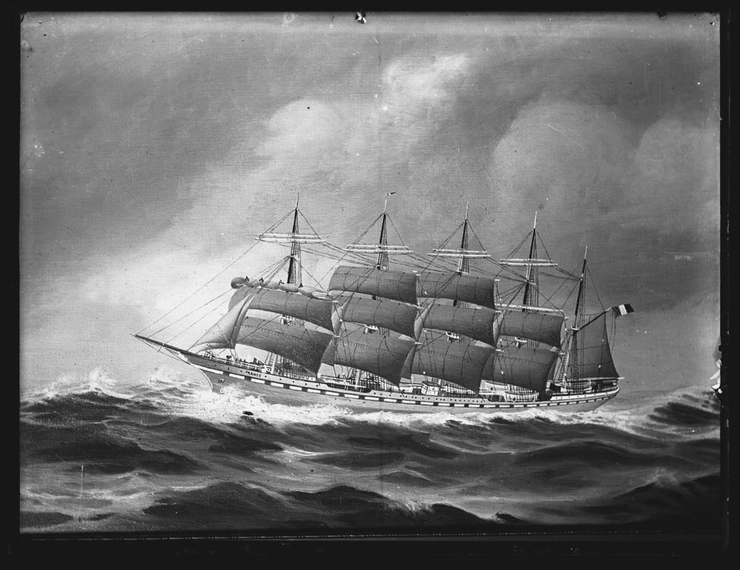 Photograph of a painting showing a port broadside view of the three-masted barque CROWN of Risor. Title of painting - ''CROWN OF RISOR CAPT SKOGLUND''