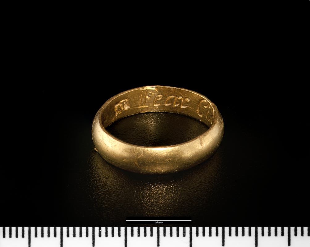 Fragment of fede ring. The hoop appears to have been of flattened D-shaped cross-section. The outer surface of the hoop is cast with clasped hands around a heart. The flat inner face is engraved in Roman capitals with the letters T I [. (possibly M, N or R; the rest of the inscription is missing).