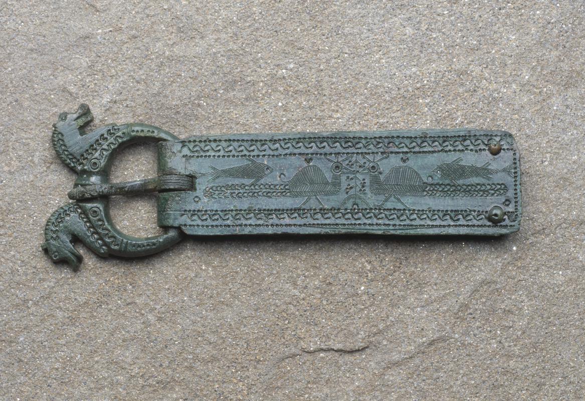 Rounded D-shaped, almost oval, buckle with internal scrolls either side of the bar to take the tongue. Traces of tinning on the front. Iron corrosion in the area of the two, circular, lugs suggests an iron axial bar and possibly also an iron pin.