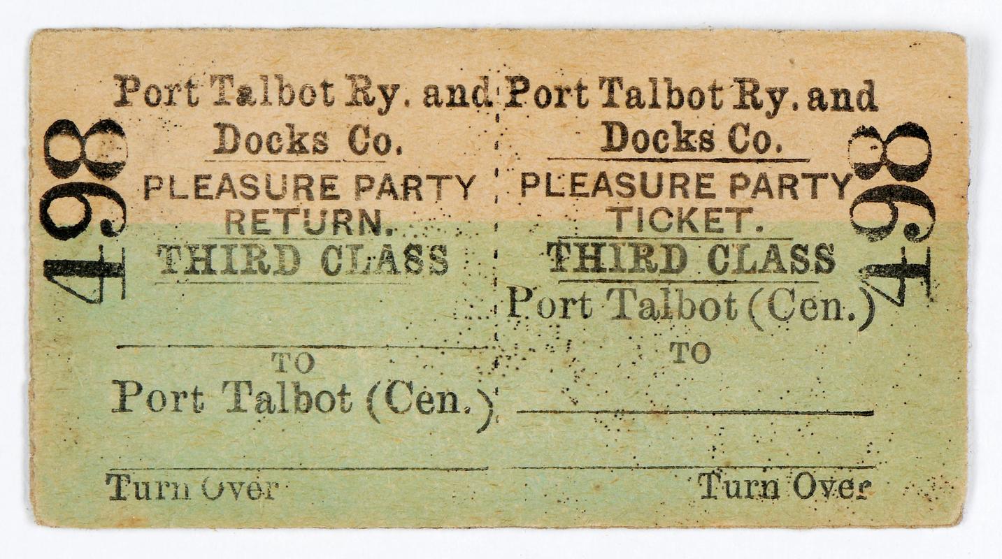Black print on blue paper with perforation down centre. Return excursion day trip Maesteg to Port Talbot (central), third class. Ticket no. '498'.