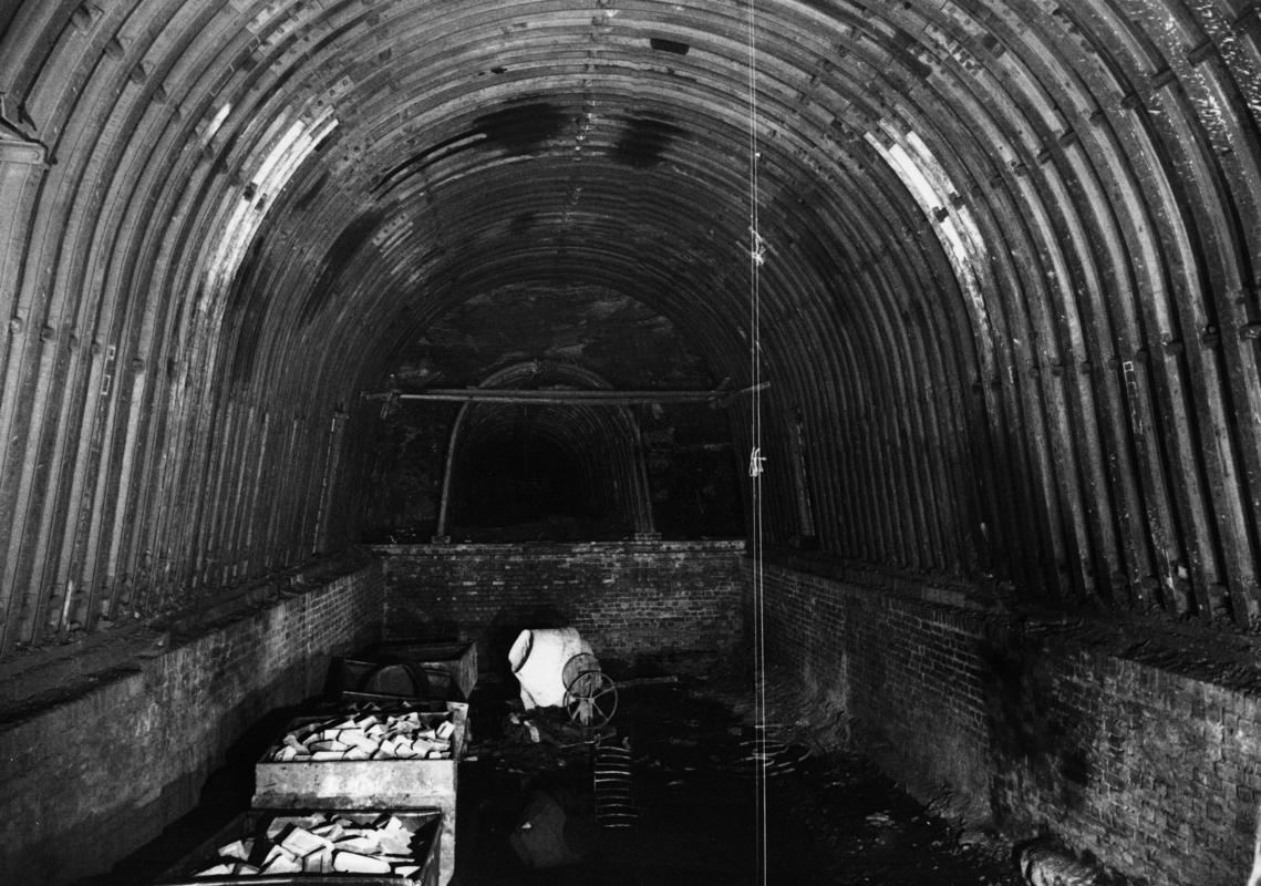 Black and white photograph showing reconstruction of pit bottom at Merthyr Vale Colliery. Pit bottom "full" side. Turntable and mine car loading bay under construction.