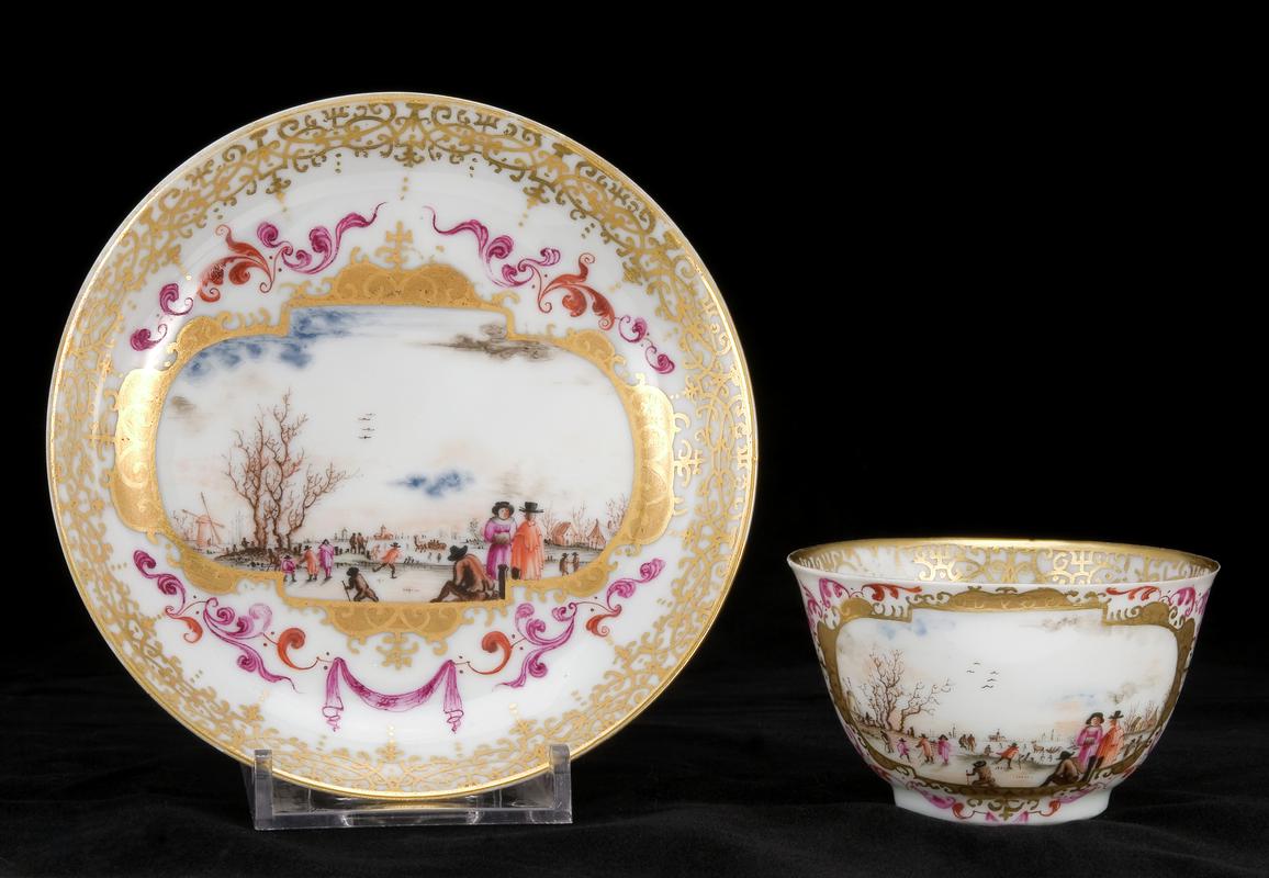 Tea bowl and saucer in hard-paste porcelain, the cup with slightly flaring rim and raised foot ring, the saucer dish-shaped with foot ring, flared rim and without a well; border of black enamel with linked 'C' scrolls in gilt on the interior rim of the tea bowl and saucer, the cup with two Meissen-style cartouches formed by black enamel and gilt scrolled borders from which issue gilt scrolls and stylised flowers in puce and red enamel, one with a painted indoor scene in polychrome enamels and the other with finely painted flowers and a flying insect in puce, the saucer with a larger version of the indoor scene on the tea bowl, also in polychrome enamels and with the same cartouche border, featuring a mother and child behind a table laid with a bowl of fruit and a vase of scrolls, behind them a window with bamboo blind looking out onto a garden.