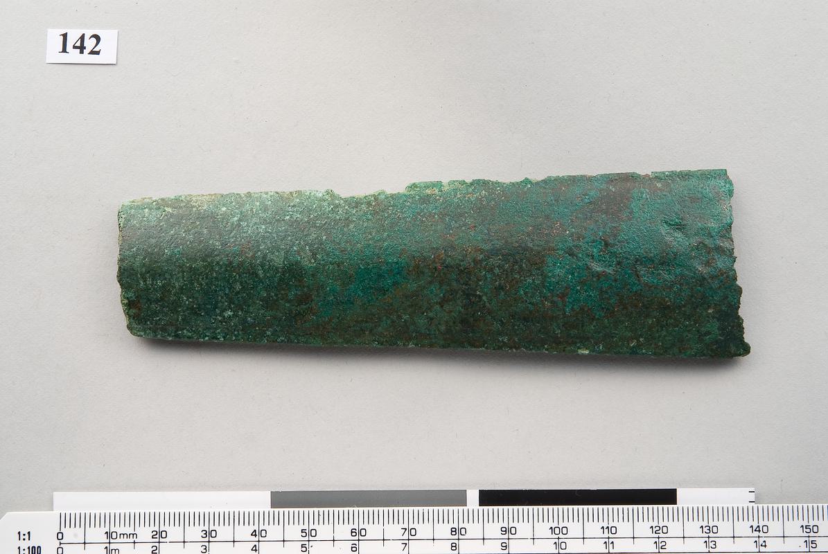 Thin-butted axe with brown patina, edges slightly hammered and blade slightly splayed, with evidence of possible recent sharpening.