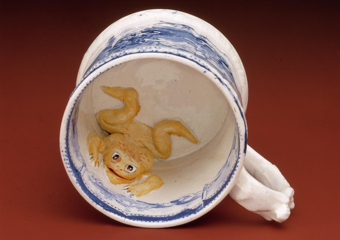 Dish, earthenware, standing on a straight-sided lobed foot-rim, in the form of a vine or cabbage leaf with curving spreading sides and shaped rim with pointed lobes, the tip of one of which is broken off, the upperside of the dish moulded to resemble the veins of the leaf, radiating out from a raised central stem; covered all over with a lustrous green glaze.