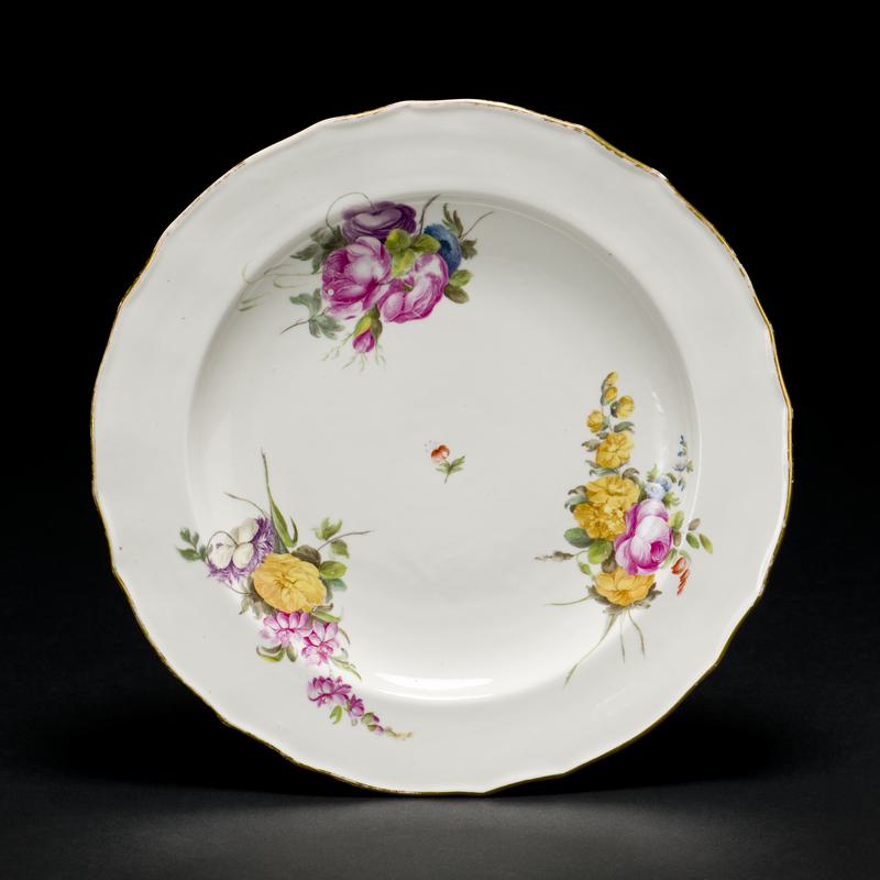Dessert plate, soft paste porcelain with clear glaze, foot ring wiped clean of glaze, cushion-moulded profile with broad flange and scalloped rim; hand painted at the edge of and over the well with three groups of naturalistic flowers and a single flower at the centre, plain gilded rim.