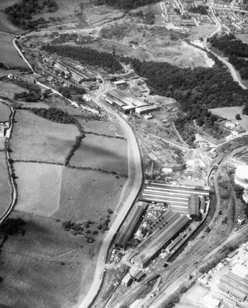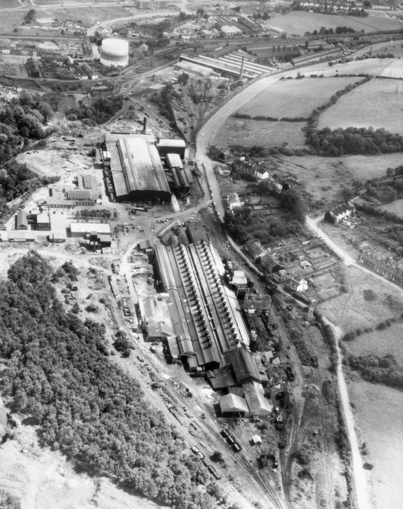 Black and white aerial view of G.K.N. Cwmbran site. Photographers stamp on reverse.