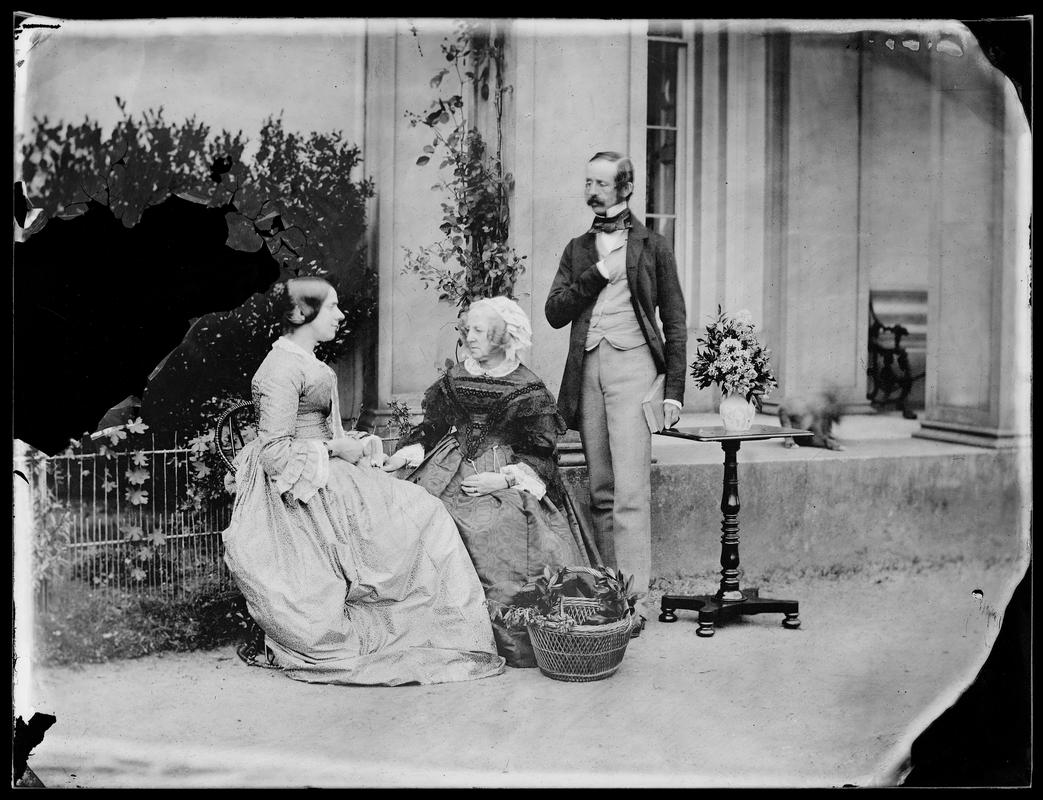 Salted paper print, from Collodion glass negative. Mr & Mrs Smith standing at left with Mme Labouchere seated next to table at right.
