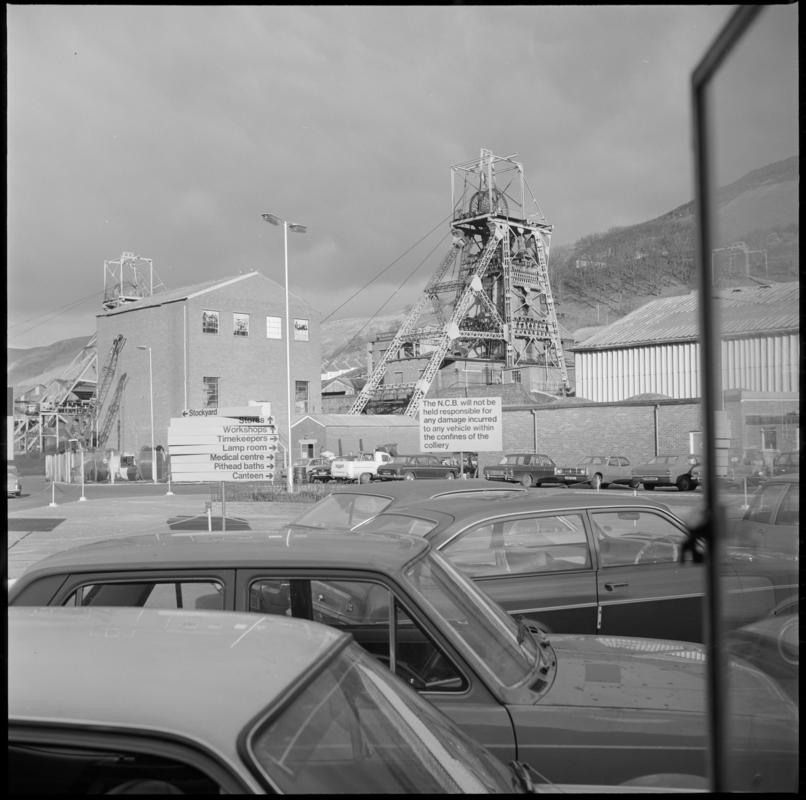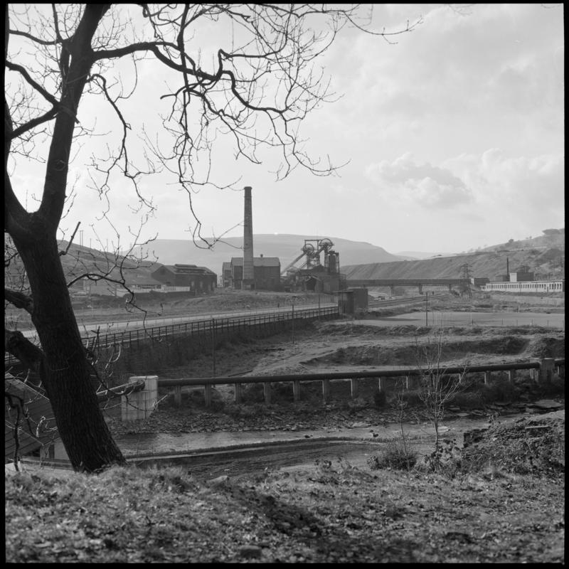 Negatif ffilm du a gwyn yn dangos rhan o ffrâm y siafft yng Nglofa Ddofn Dyffryn.