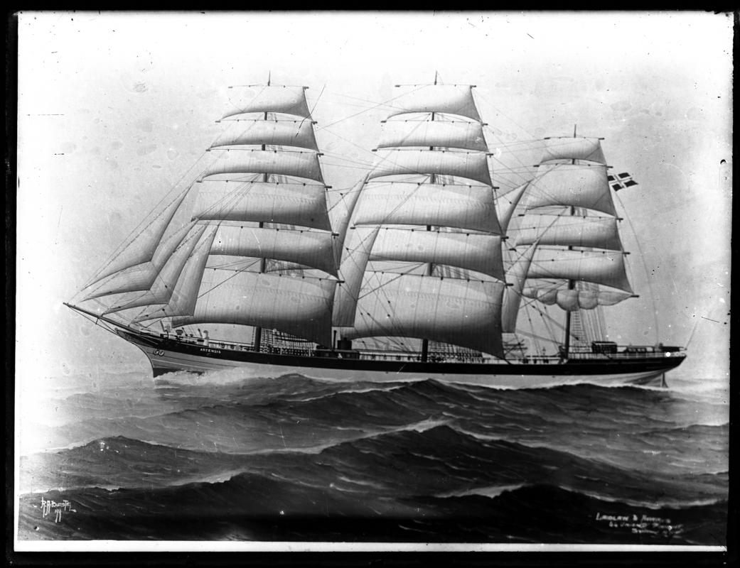Photograph of a painting by R.A. Borstel showing a port broadside view of the four-masted barque SPEEDONIA. The original of this painting is in the Newcastle (New South Wales) Maritime Museum.