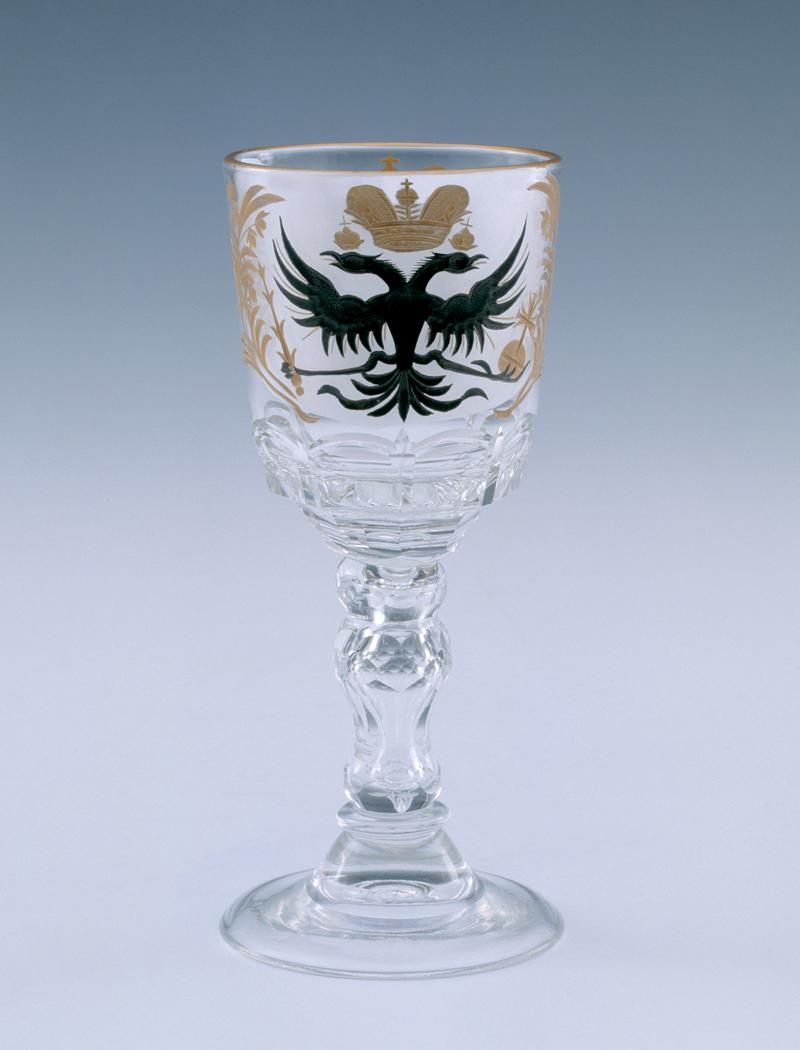 Drinking glass, plain conical foot, waisted baluster stem cut into diamond and oval facets, bucket bowl cut with oval facets around the base, the bowl wheel-engraved with to one side the Russian Imperial Double Eagle surrounded by foliage and to the other side the Imperial monogram of Tzar Nicolas II enclosed by a cartouche of banners and a crown, the wheel-engraving in-filled with black enamel and gilt.