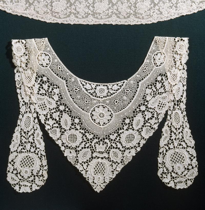 white pleated net; triangular shape; edged with machine embroidered motifs.