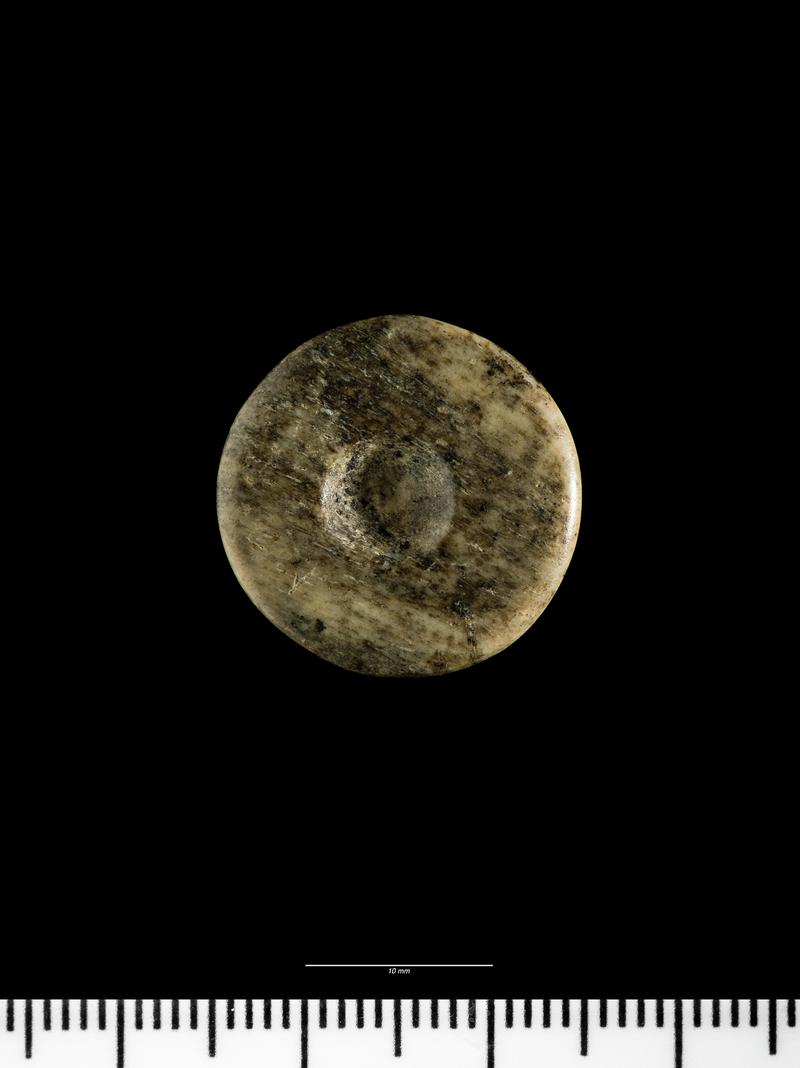 Central Gaulish glazed ware bottle with relief decoration, Dechelette form 60 (bulbous). Burnt, glaze largely gone, rim chipped.