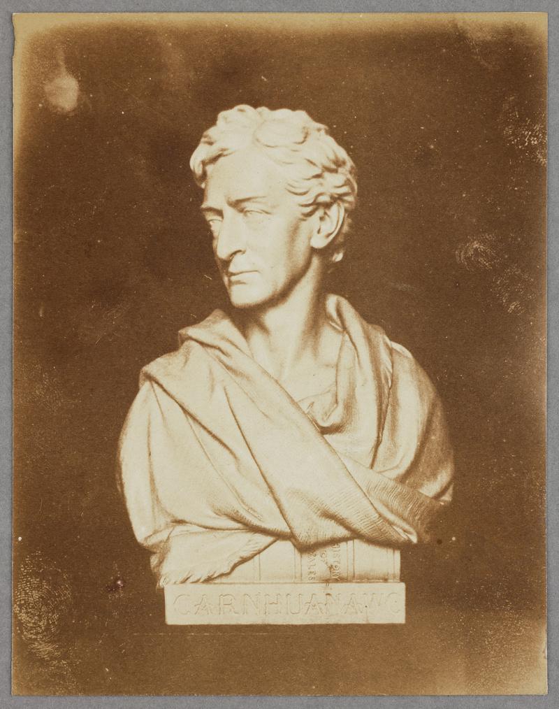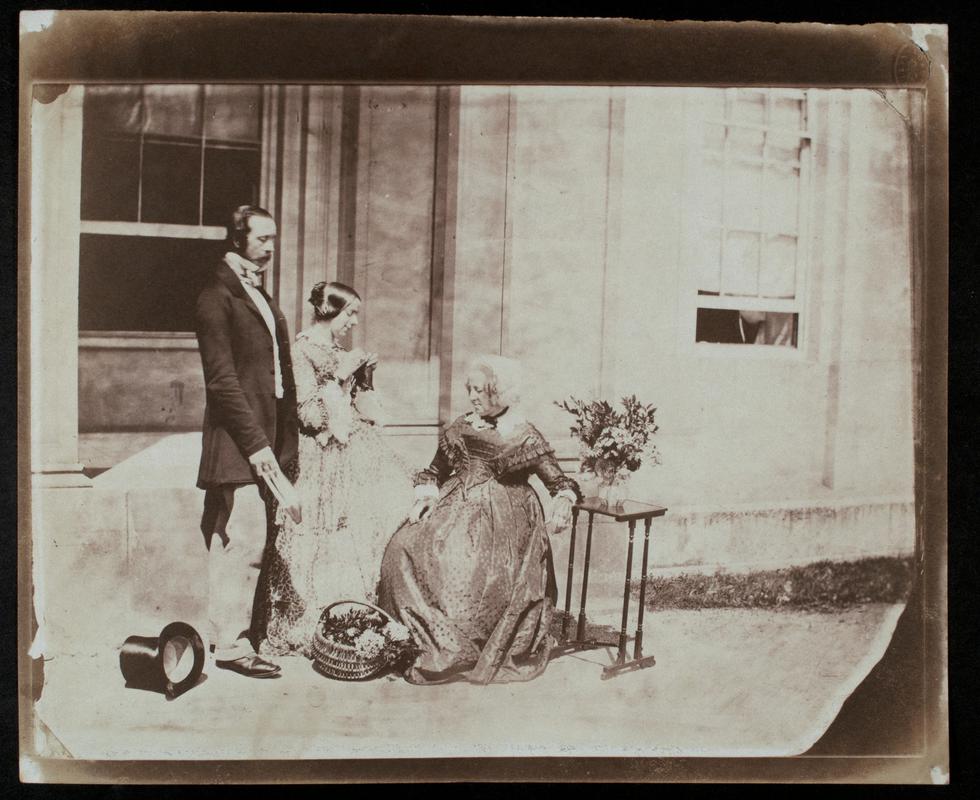 Salted paper print. Girl (Minnie?) seated in chair with girl standing next to her.