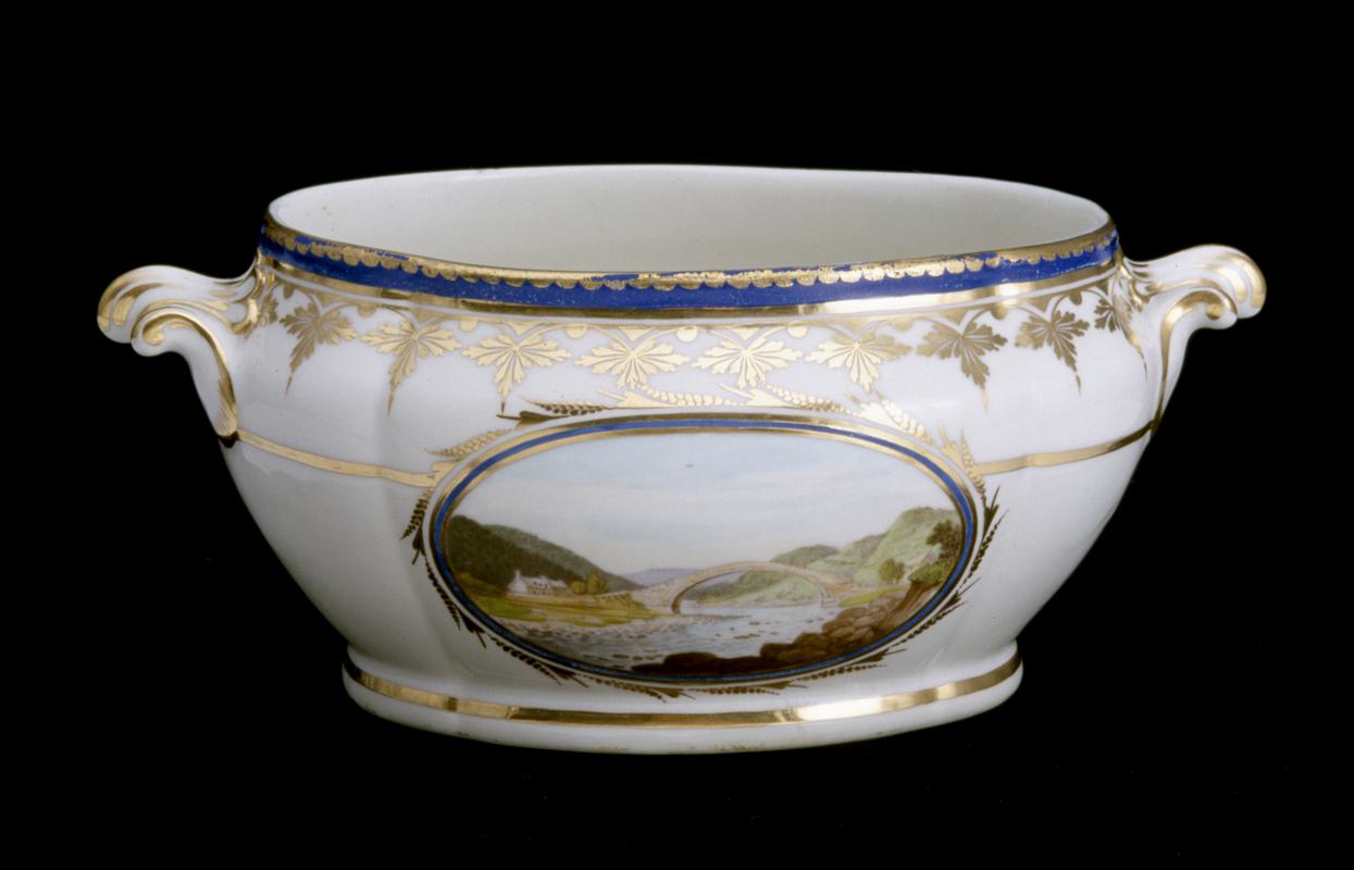 Plate, soft-paste porcelain, greyish paste with a creamy brown translucency, standing on a shallow foot rim, dish-shaped with pronounced cavetto and waved, fluted rim; the centre painted in polychrome enamels with a circular titled scene, 'View in / Macnarthen' [sic], featuring a waterfall on Nant Cell, a tributary of the Ystwyth, as it begins its steep descent to join the river in the gorge, just west of the village of Pontrhydygroes; framed by a blue line edged with gold and gilded sprays, the rim with gilded pendant leaves below a blue border and gilded dentil edge.