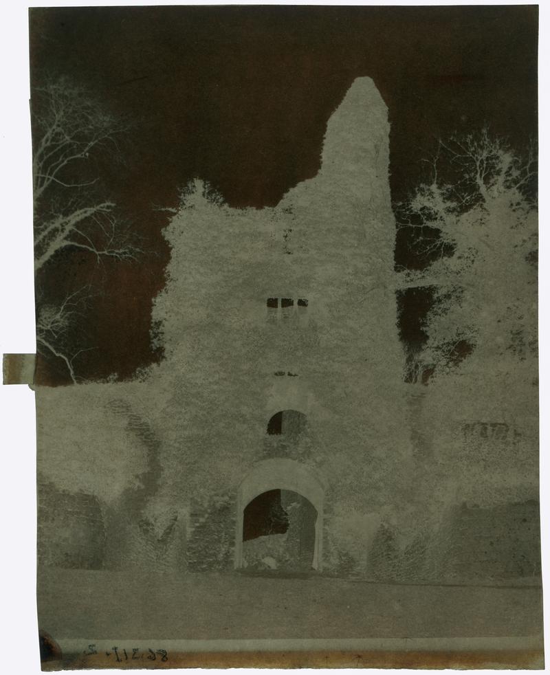Salted paper print. View of single-arch Roman Bridge, Blackpill, with man and woman sitting on parapet with another man and woman standing off bridge to left. All corners clipped.