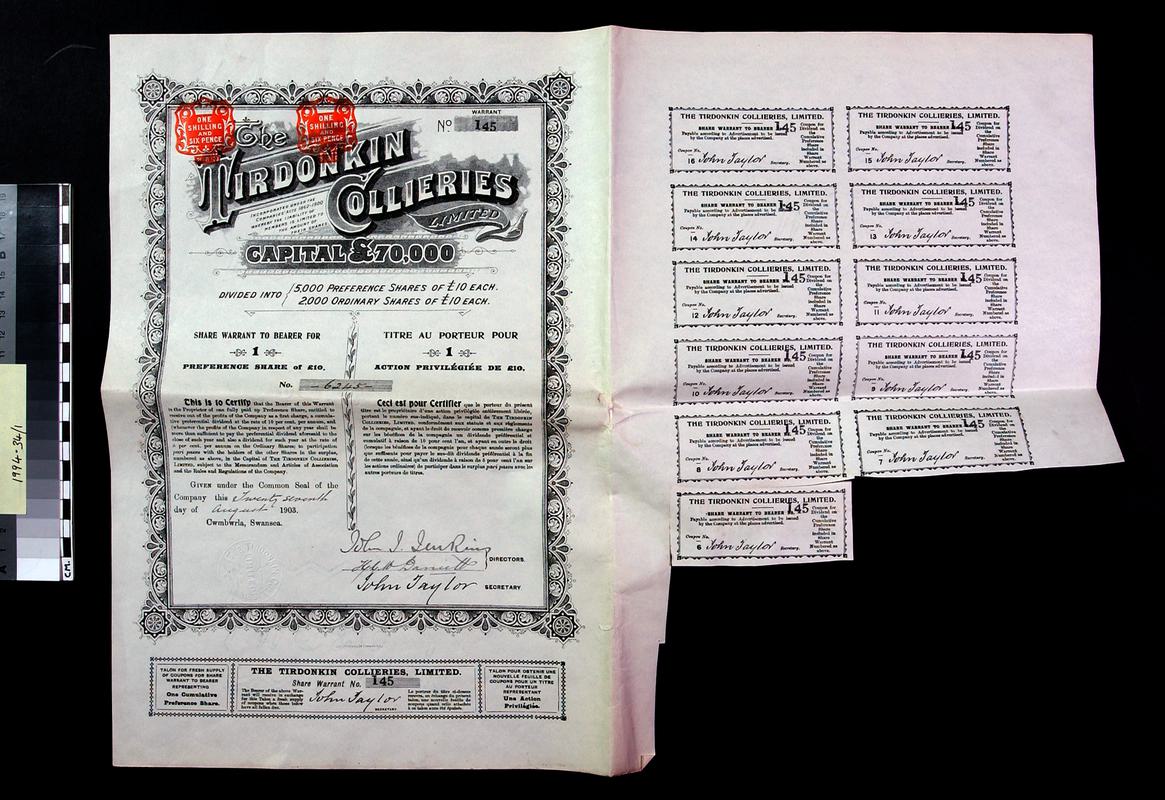 The Bryn-Rhyg Collieries (1930) Limited, 10/- ordinary shares, 1931, black and blue on white. * Black and blue print on white paper with handwritten details completed in black ink. Ornate border surround. Embossed company seal on lower right hand corner. 60 10/- shares numbered 8855 to 8915. Certificate number '14'. Dated 21 January, 1931.
