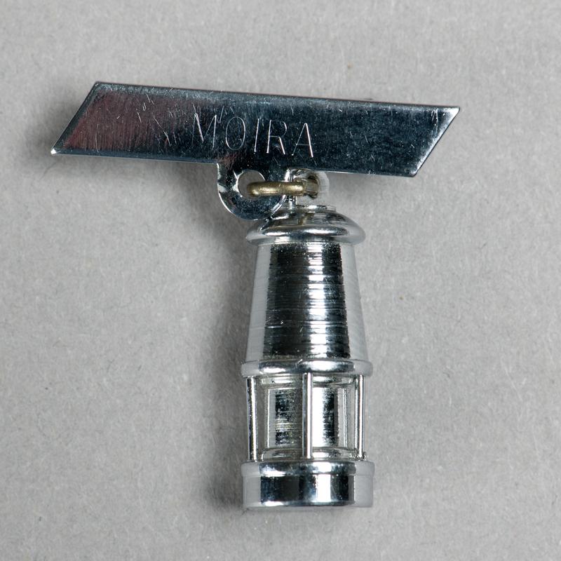 Circular metal badge with headgear in a blue shield at centre supported by two miners. Inscription around set in white and red enemel. Pin clasp on reverse.