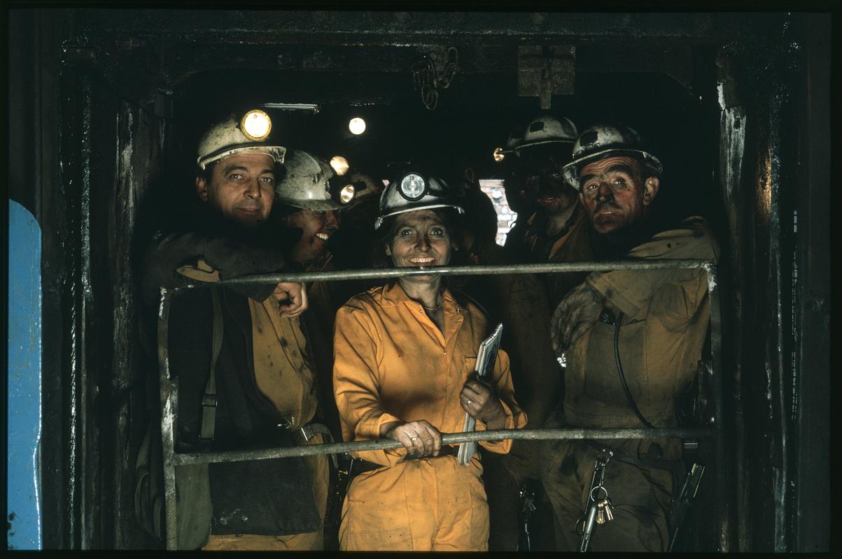 View of miner Dai Williams (who later became a guide at Big Pit) looking at the fossil tree trunk (or 'sigillaria') found above the coal at Six Bells Colliery, while a roadway was being driven between Six Bells and Blaenserchen Collieries.