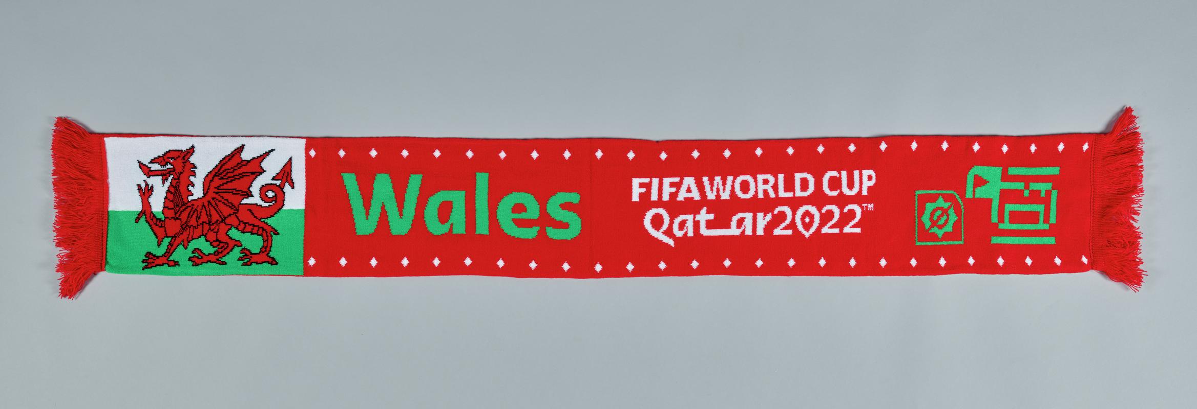 Red hand knitted scarf made by the listeners of BBC Radio Wales Breakfast show Jamie & Louise the scarf was shown at the wales home games during the 2010 Six nations. The scarf stretched to over a mile long. List of contributors in object file and saved on S drive
