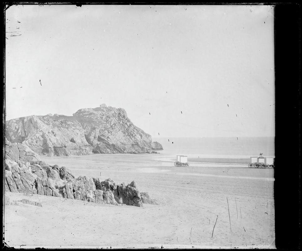 Mounted salted paper print (from collodion negative) showing St. Catherine's Island and and bathing machines on the sandy seashore.