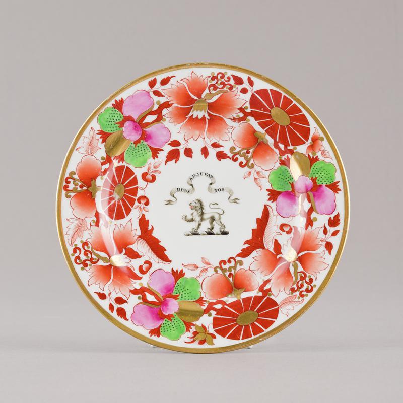 Small plate, lobed rim, painted in thick bright underglaze blue and red and pink enamels with Queen Charlotte pattern, outlined in gilt, broad Japanese running scroll and mon border,gilt line rim
