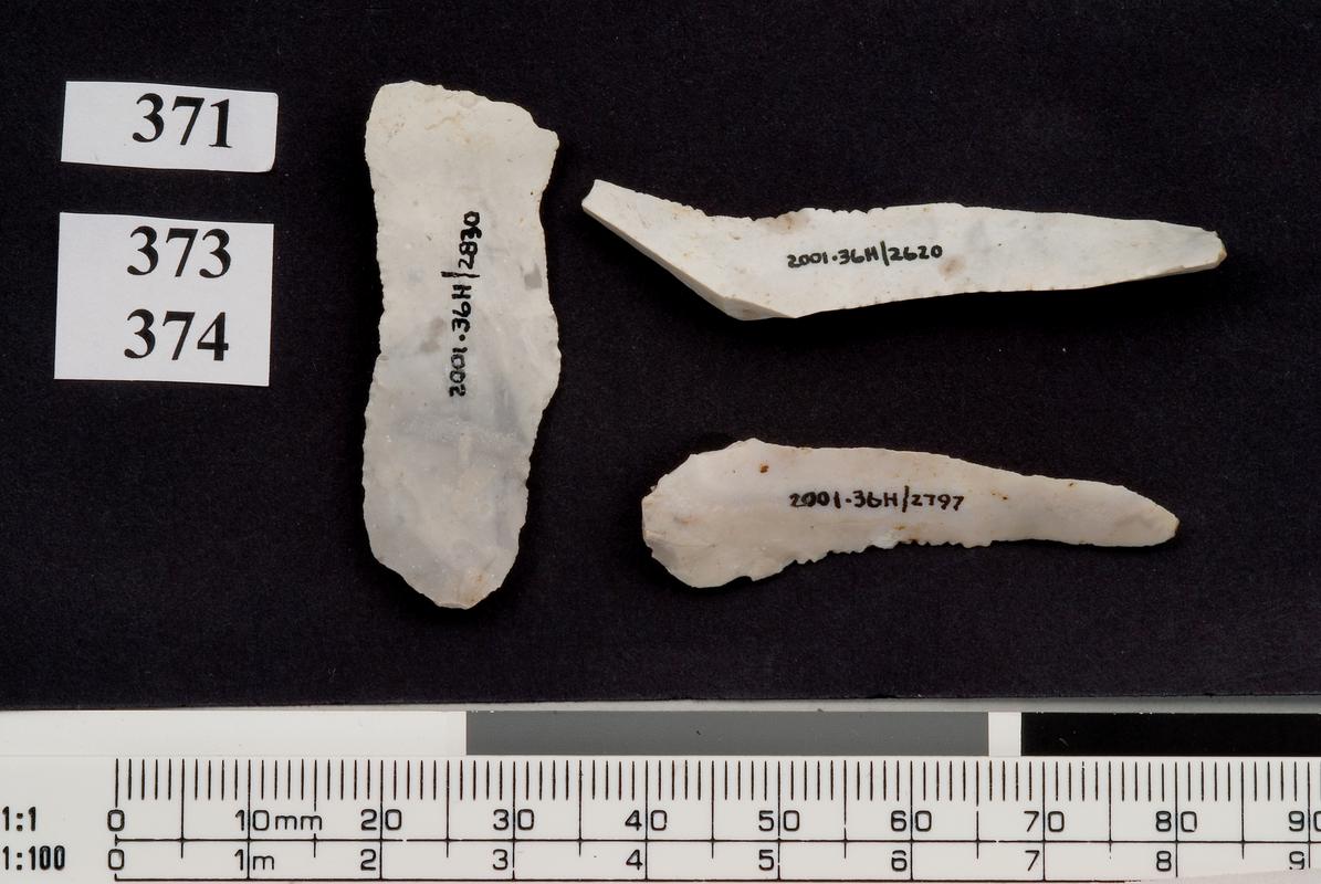 A complete perforated stone bead. The blank is circular in shape and the perforation is in the centre. The bead has been perforated by drilling from one side. The hole is very small and slightly irregular in shape.