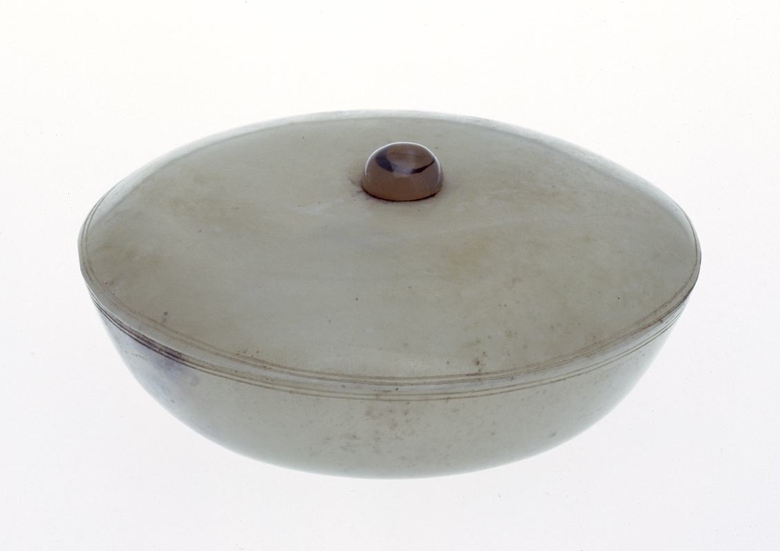 Figure, seated, cross-legged Buddha, grey-green jade, chest decorated with small pieces of red and blue glass, with a stand of gilt bronze and wood rising behind the figure.