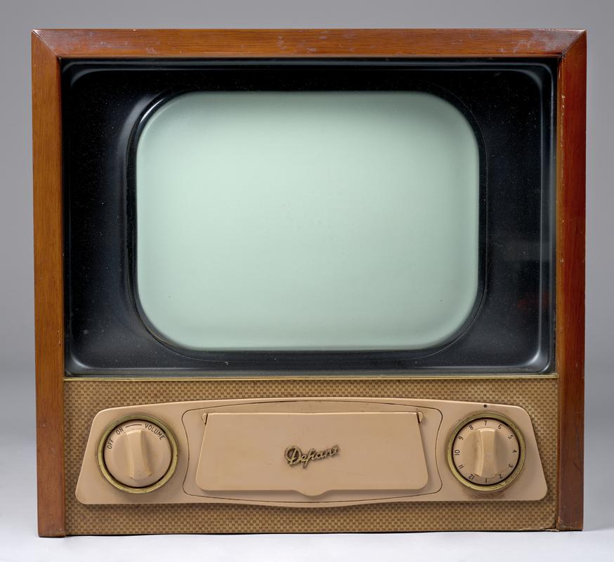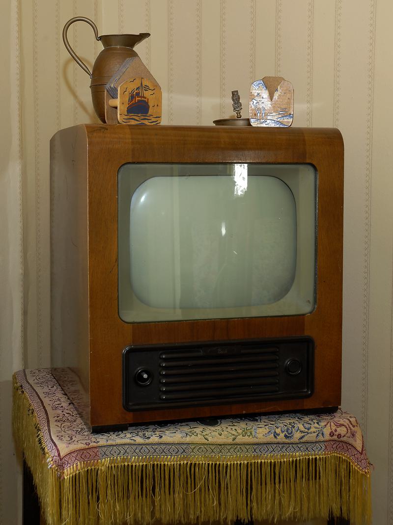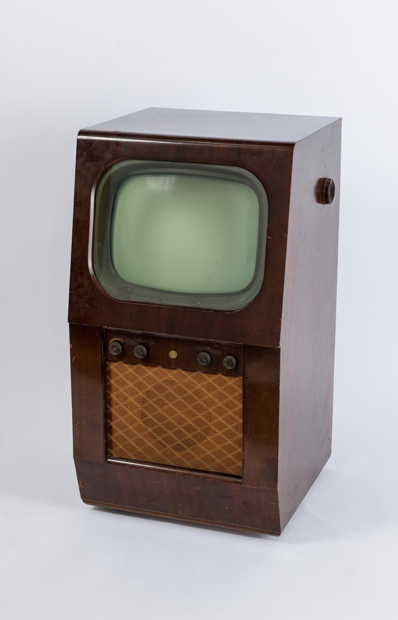 Bullseye optic perspex magnifying lens attached to oak stand by two knurled bakelite knobs which can be adjusted to vary the height of the lens; placed in the front of television screen to magnify the picture.