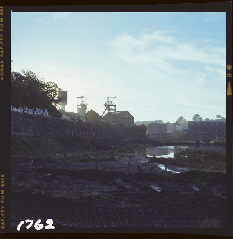 Black and white 35mm film negative showing Penrhiwceiber Colliery, May 1976. 'Penrikyber May 1976' is transcribed from original negative bag.
