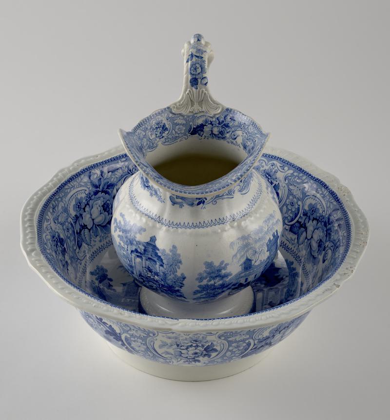 Bowl, earthenware, standing on a rounded waisted foot, the lower body with short concave sides, then rising to rounded curving sides in the upper body; transfer-printed in blue with to the exterior sides of the bowl the 'Haymaker' pattern, in the foreground a female figure rakes hay whilst behind her several male figures create a haystack, in the background are trees, a house and fields, a flower head and dot border to the exterior lip-rim, a spray of flowers to the interior bottom of the bowl, wide border to the interior lip-rim of sprays of flowers on a dotted ground.