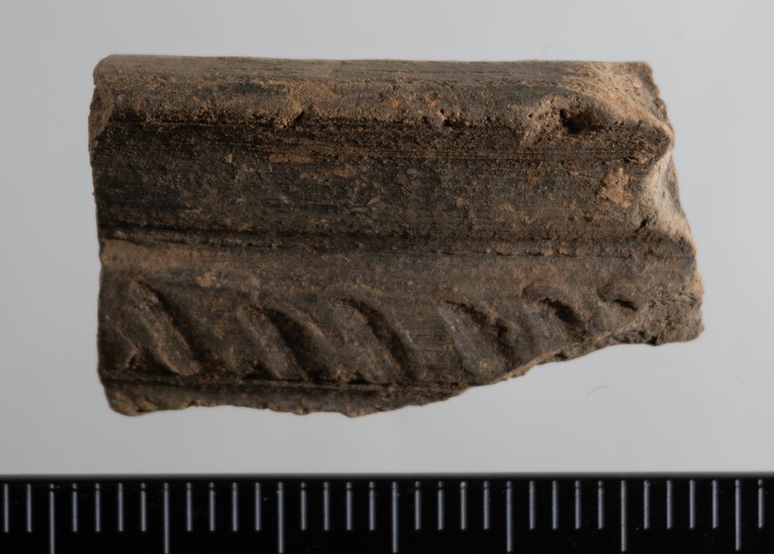 x1 grey ware pot lid sherd; x5 grey ware jar sherds; x1 red ware handle; x1 red ware flagon sherd; x1 Caerleon ware flanged bowl sherd; x1 grey ware handle; x1 red ware micaceous vessel body sherd, possibly flagon.