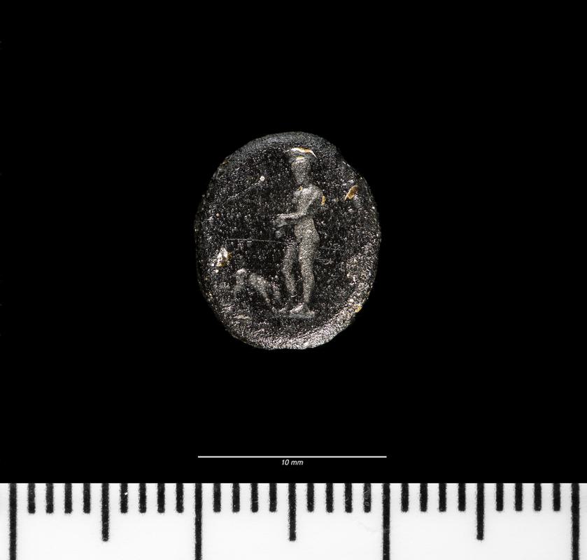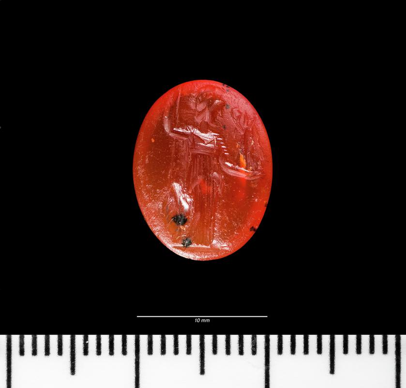Oval of heliotrope. Depicts Ceres seated on a stool left. She wears a chiton and a himation; around her head is a fillet or diadem. In her right hand is probably an ear of corn. Her left arm supports her. Behind the goddess is a transverse scepter.