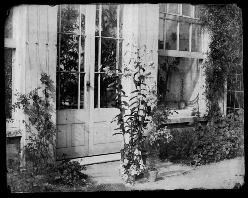 Calotype negative showing wheelbarrow and broom in the rockwork garden at Penllergare.